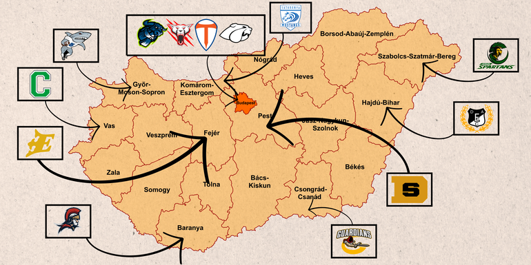 Budapest Cowbells, Budapest Titans, Budapest Wolves, Újpest Bulldogs (Budapest), Dabas Sparks (Dabas), Tatabánya Mustangs (Tatabánya), Spartans AFC (Nyírpazony), DEAC Gladiators (Debrecen), Guardians (Szeged), Legioners (Pécs), Fehérvár Enthroners (Székesfehérvár), Crushers (Szombathely), Győr Sharks (Győr), Diósd Saint (Diósd), Oroszlány Bears (Oroszlány), VSD Rangers (Dunakeszi)
