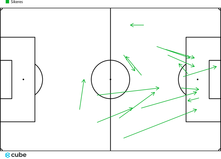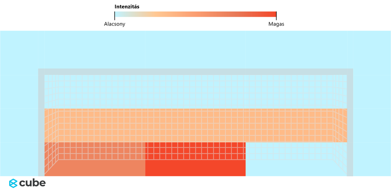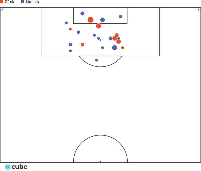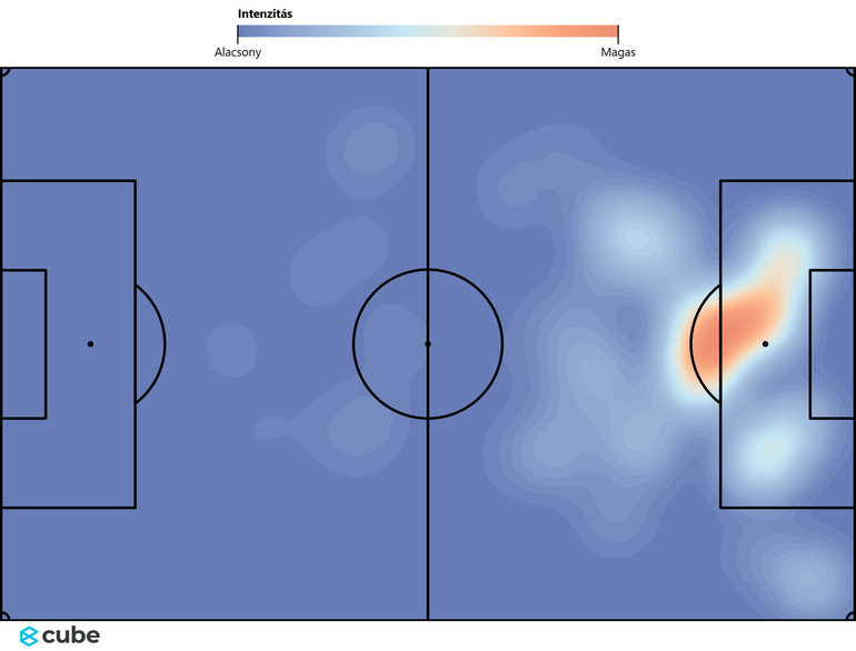 A hőtérképen látható, hogy melyik területen kapja Haaland a labdákat, ahonnan veszélyt alakít ki az ellenfél kapujára. Bal lábasként nem meglepő, hogy középről inkább balra indul el, hogy onnan tudja befejezni a támadásokat.