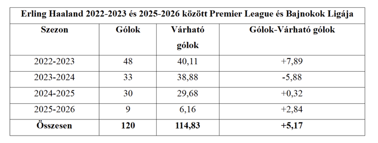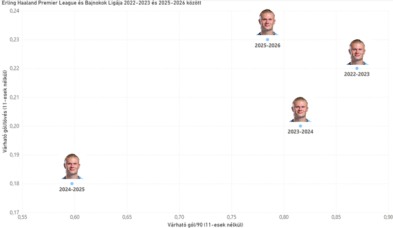 Erling Haaland legnagyobb erősségei a jó lövőhelyzetbe kerülése és a kiváló befejezései, amikkel rendszeresen felülteljesíti a várható gól értékeit. A Bajnokok Ligáját és a Premier League-et tekintve a Cityben idén 9 gólját 6,16 xG-ből érte el, tavaly 30 gólját 29,68 xG-ből rakta össze, két szezonnal ezelőtt 33 gólját 38,88 xG-ből, ami az első alulteljesítése volt felnőtt pályafutása során, előtte pedig 48 gólt szerzett 40,11 xG ellenére, tehát a 2023–2024-es szezonban őt is utolérte az átlaghoz való regresszió.