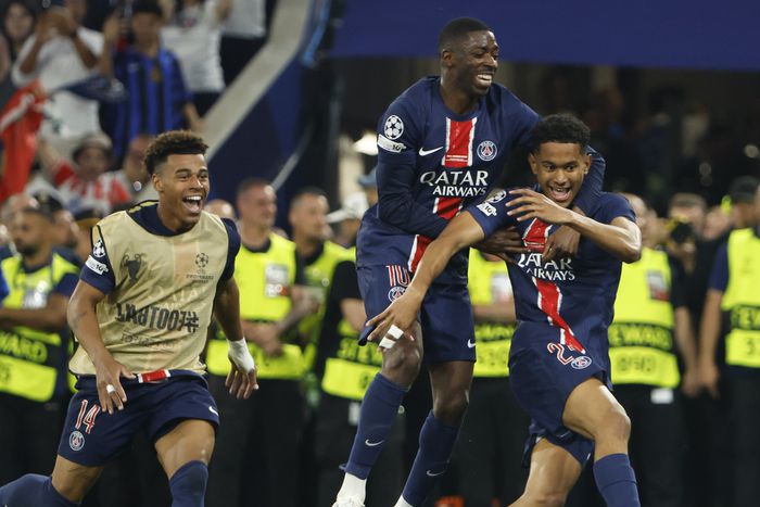 Nem csak a BL-trófeának örülhet Dembélé (középen) és Doué (jobbra) (Kép: Getty)