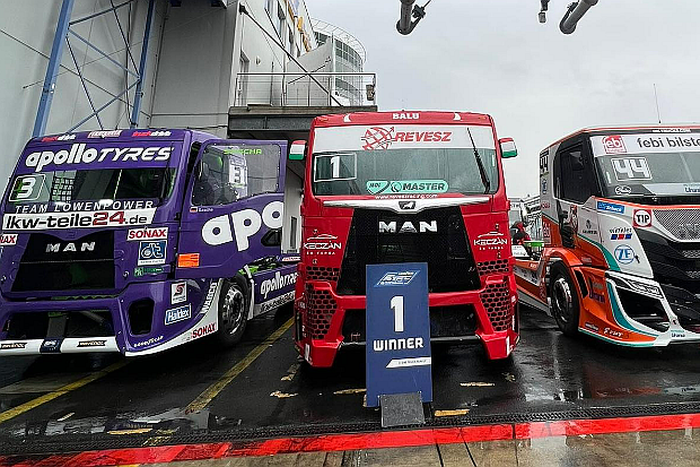 A versenyt a kilencedik körben piros zászlóval leintették, az egyik kamion ugyanis a sóderágyban kötött ki és a versenybíróság biztonsági okokból már nem hagyta lefutni a hátralévő távot. A program 13.35 órától a hétvége második időmérőjével folytatódik a Nürburgringen, majd 18 órakor rendezik a harmadik futamot. A hétvége vasárnap 13.35-kor a negyedik viadallal zárul.