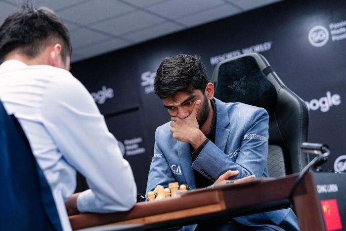 Szóval a 18 éves indiai élesebben kezdte a mérkőzést, mint legutóbb, és szemmel láthatóan az egyenlítést tűzte ki célul, egy ideig azonban a kínai tartani tudta az egyensúlyt a táblán. Aztán Gukesh egyre inkább fölénybe került, a kínai meg időzavarba, az időellenőrzés előtti kilenc lépésére két percnél is kevesebb ideje maradt.