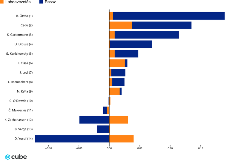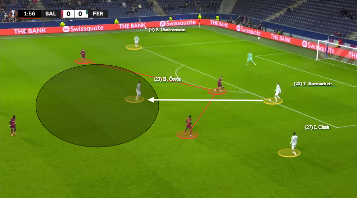 Ahogy a várható veszély (xT) ranglista is mutatja Ötvös Bence volt a Ferencváros legprogresszívebb játékosa, ő tudta a legnagyobb mértékben a labdát a pálya veszélyesebb zónáiba juttatni. A Salzburg igyekezett inkább a pálya két szélét lezárni, azonban a Ferencváros eddig az Európa-ligában inkább a centrumban birtokolta többet a labdát, míg a széleken jóval kevesebbet, és már csak a 3-5-2-es alakzat számtani részéből is az következik, hogy a Fradi a pálya közepén lesz létszámfölényben, emiatt is volt kiemelten fontos a Salzburg letámadási sémája és a Fradi sikeres építkezése.
