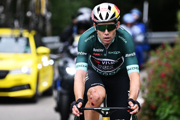 A zöld és pöttyös trikós Wout van Aert több mint 50 kilométerrel a vége előtt sziklafalnak csapódott, majd visszaült kerékpárjára, de az eddig három szakaszsikerrel rendelkező 29 éves belga versenyző karjai és lábai is megsérültek az ütközésben, így néhány perccel később kénytelen volt feladni a szakaszt és a Vueltát is.